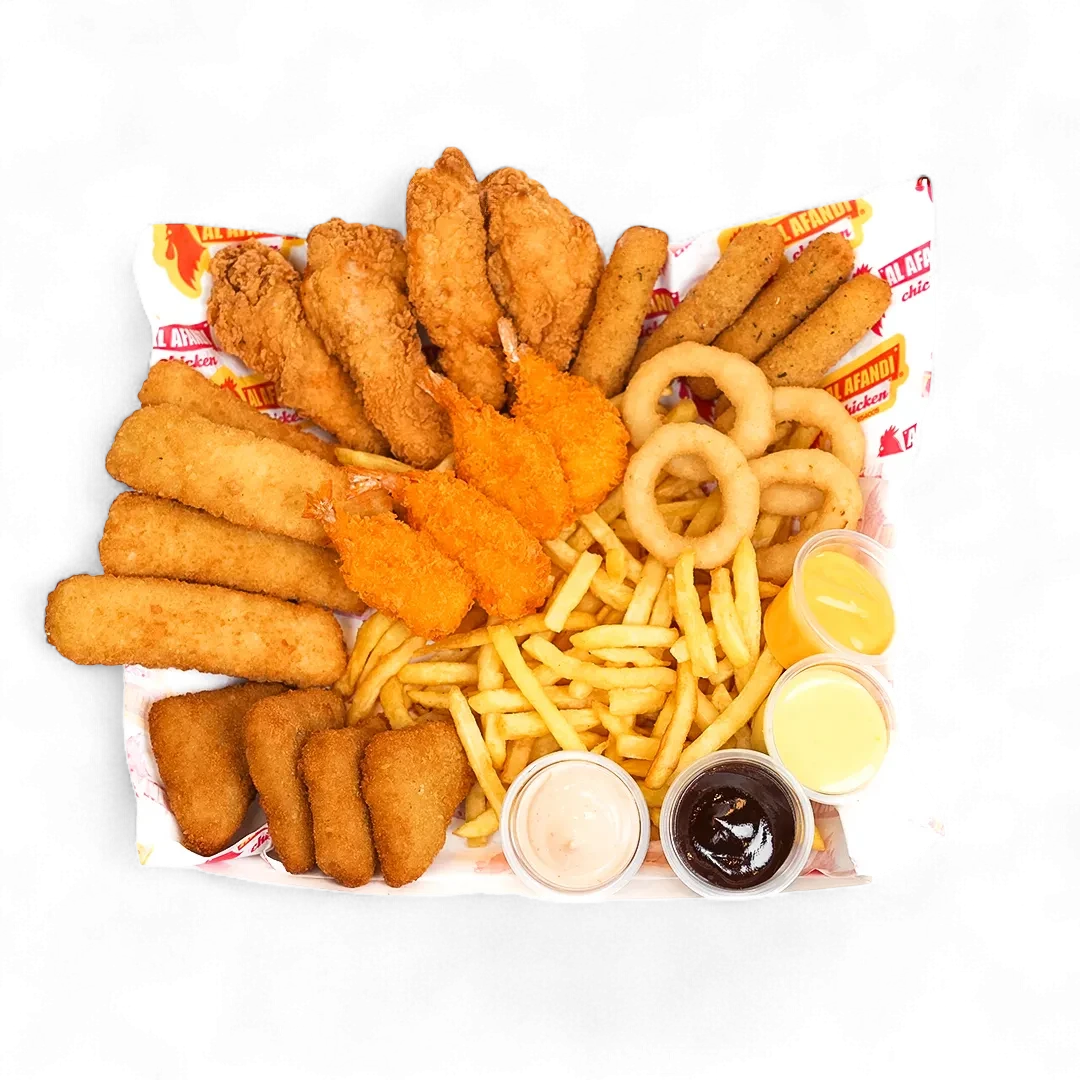 4 crispy, 4 jalapeno bites, 4 halloumi sticks, 4 shrimps, 4 mozzarella sticks, fries with honey barbecue cocktail and cheddar sauce